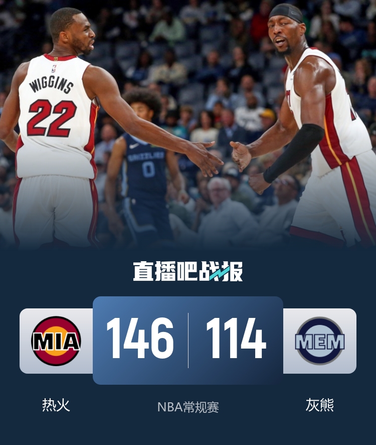 一开场,阿德巴约5分钟独得18分,灰熊多点开花给出回应,此后热火持续发力,攻防两端压制对手,丰泰基奥频频三分命中,热火轰出22-4确立领先,次节热火牢牢占据场上主动,内外开花继续扩大分差,灰熊攻防两端办法不多,半场战罢热火86-47领先灰熊。下半场,灰熊奋力反击稍稍缩小分差,热火板凳再度发力稳住局势,末节热火再度将分差拉开到40分以上,灰熊努力追赶稍稍缩小分差。最终,热火客场146-114大胜灰熊。