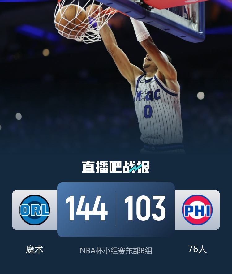 比赛上来,魔术先拿四分抢占先机,不过76人及时调整追了回来,整个第一节双方的对抗都很激烈罚球不断,次节轮换阶段,魔术替补阵容打出一波14-4的攻势直接将分差拉开到两位数,其中布莱克只打了12分钟就已经刷新生涯得分纪录,76人的防守千疮百孔被魔术单节狂轰51分,节末两队发生冲突,贝恩、沃克、小卡特和德拉蒙德各吃技犯,萨格斯累计两次被驱逐,半场结束76人落后26分;下半场回来,76人的表现依旧没有好转,还是攻不进防不住的状态,分差被继续扩大到40分以上,末节比赛早早失去悬念,不过由于杯赛算净胜分,魔术也没有太放松,最终魔术大胜76人拒绝连败。